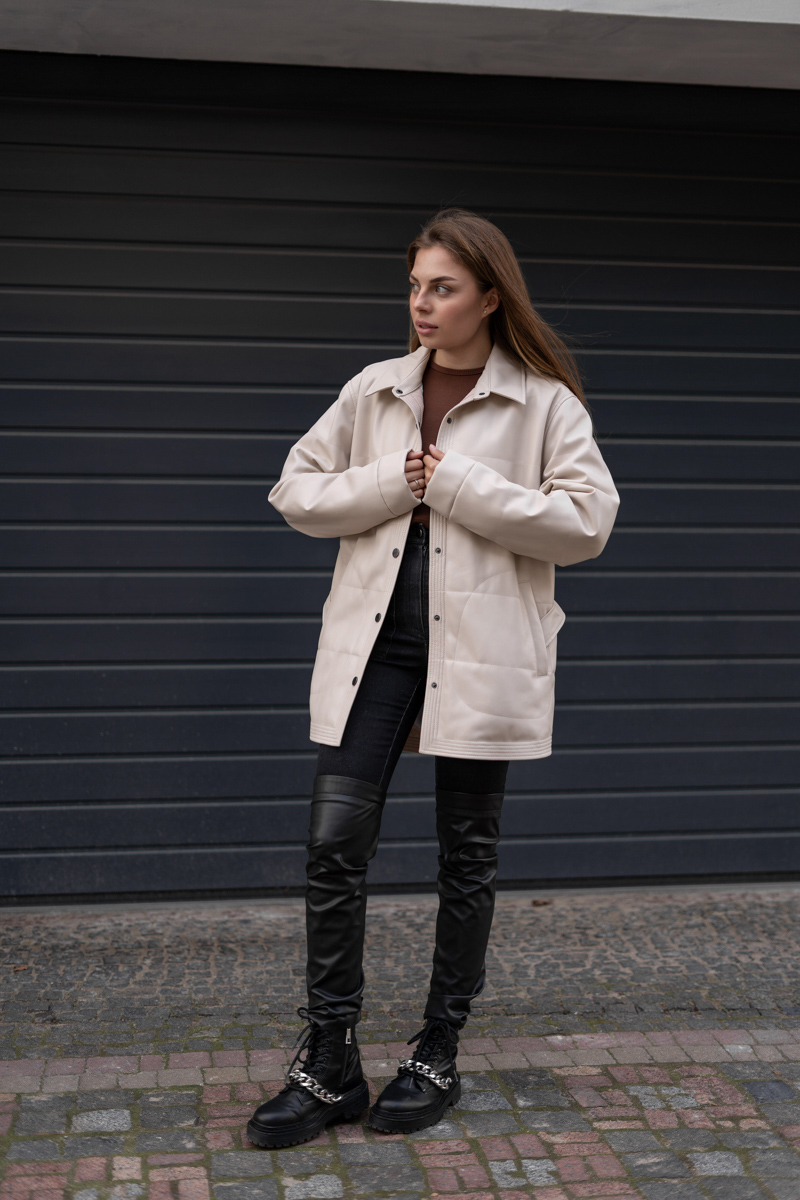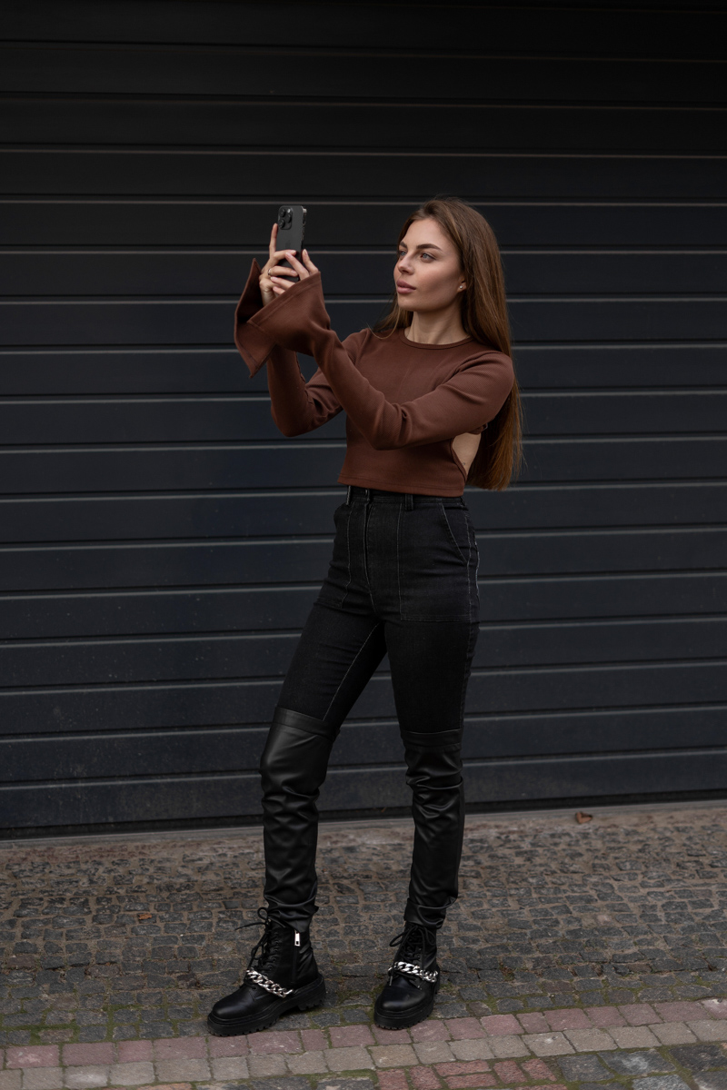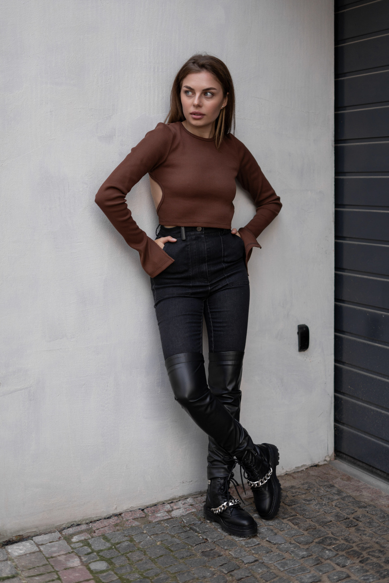 Джинси облягаючі, виготовлені зі стрейчевого деніму та стрейчевої екошкіри. Висока посадка, застібка на блискавці. Дві бічні кишені, дві задні накладні кишені. Спеціальна технологія стрейчевого матеріалу дозволяє джинсам витягуватися та повертатися до своєї форми, забезпечуючи при цьому комфортну посадку і стійкість до зносу. Це особливо зручно під час активних рухів та повсякденних занять.