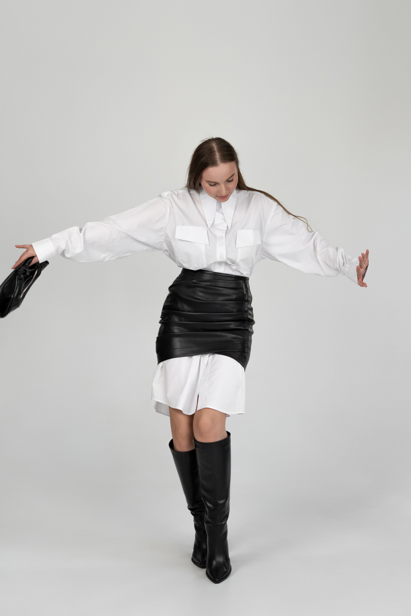Pencil mini skirt is narrowed with a decorative draped scent. High fit, zipper on the back.