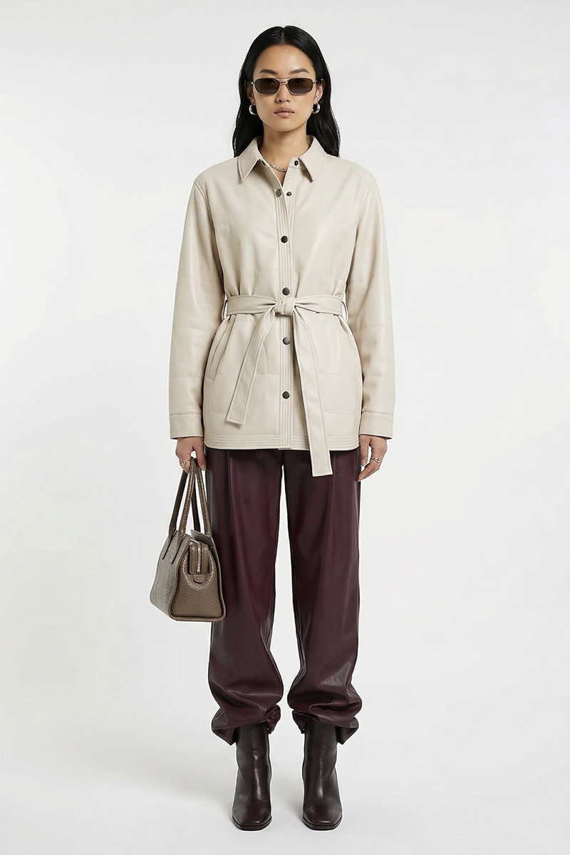 Куртка виготовлена з екошкіри на легкому утеплювачi. Рукави на манжетах, невеликий комір та застібка на кнопках, є кишені. Куртку можна носити під пасок. Крім того, вона дуже легка та комфортна, що робить її ідеальною для використання в міжсезоння, коли температура не настільки холодна, щоб носити важкі зимові куртки. Куртка представлена в розмірі XS-M та ML-XL.