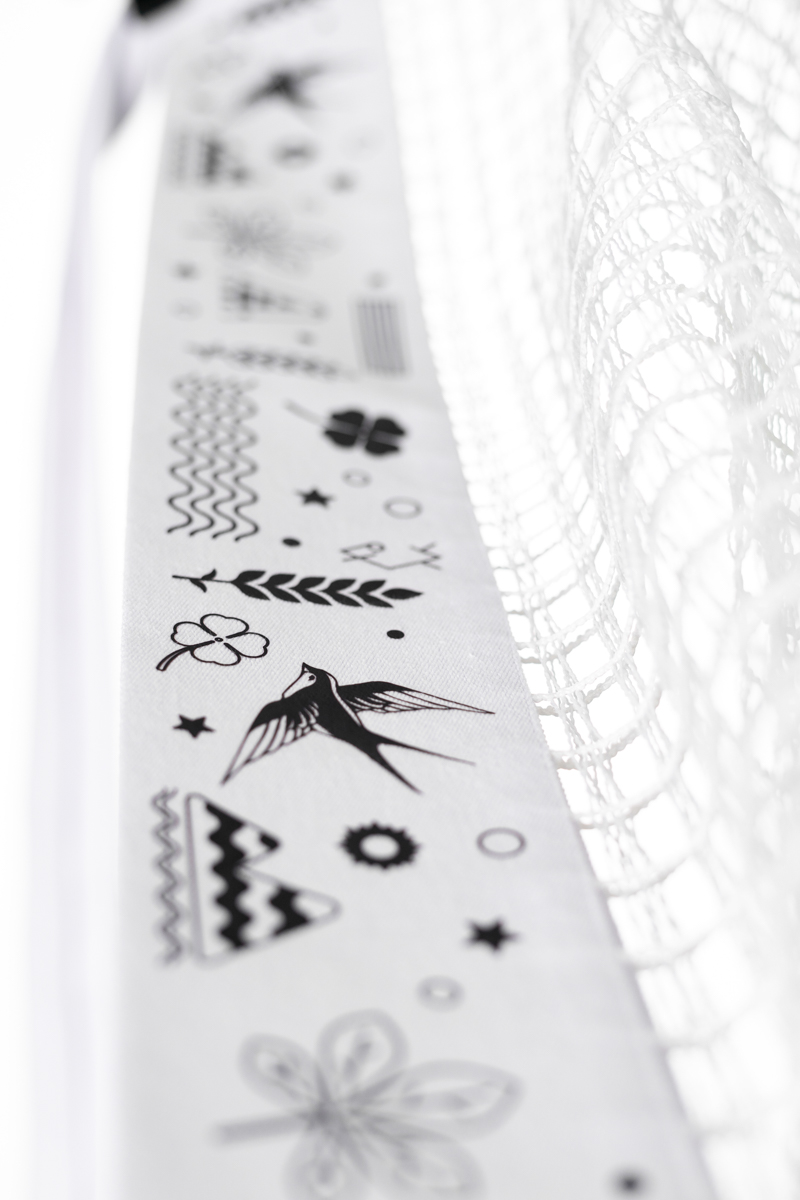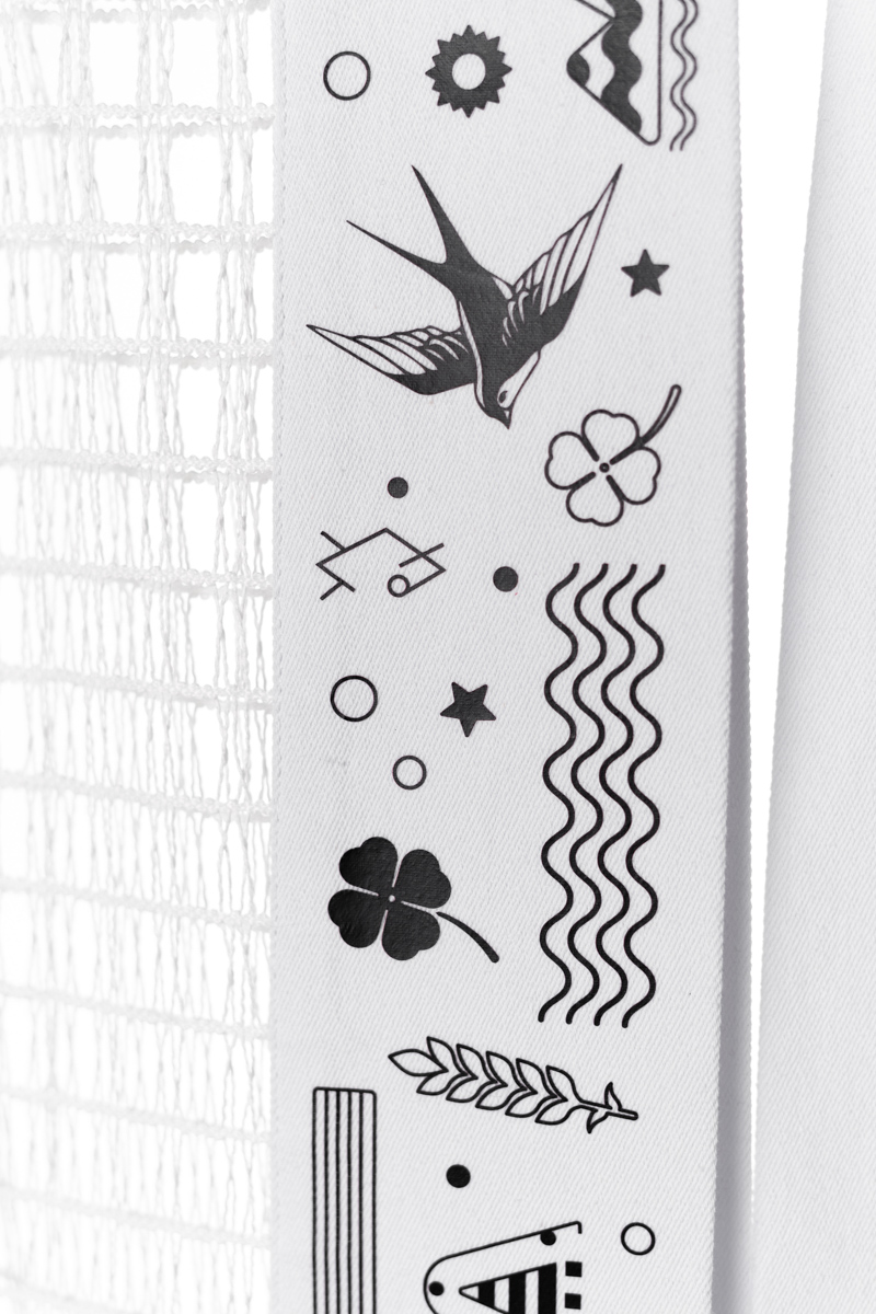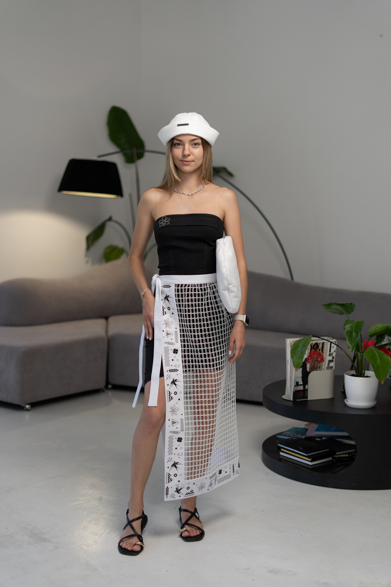 Виріб виготовлений з білої джинсової тканини у поєднанні з білою сіткою та контрастним принтом. Малюнок об’єднує етнічні мотиви та сучасну графіку, додаючи виробу особливого характеру.