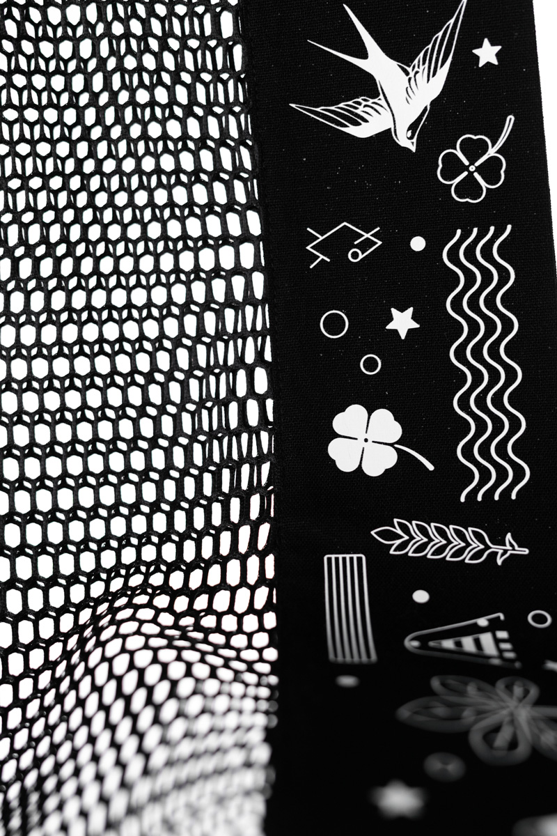 Виріб виготовлений із чорного льону у поєднанні з чорною сіткою та білим принтом. Малюнок об’єднує етнічні мотиви та сучасну графіку, додаючи виробу особливого характеру.