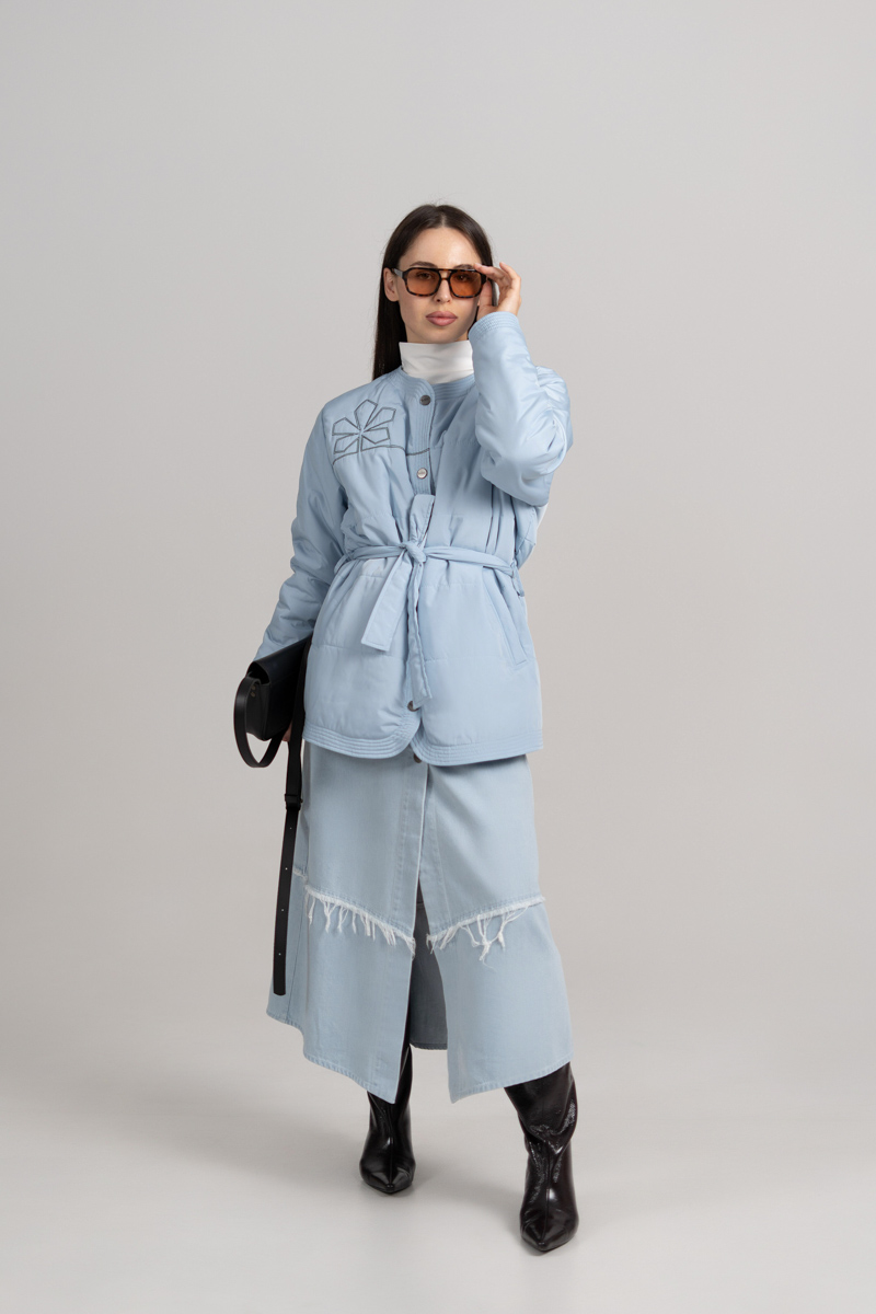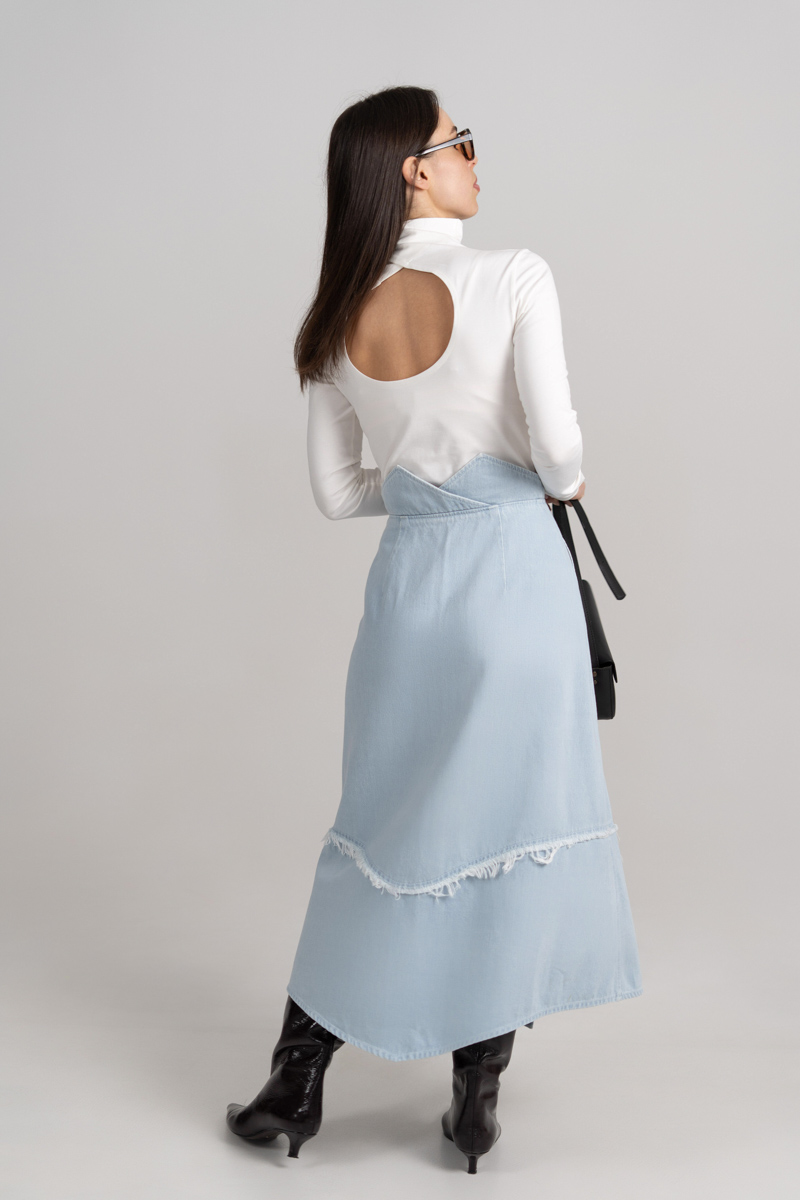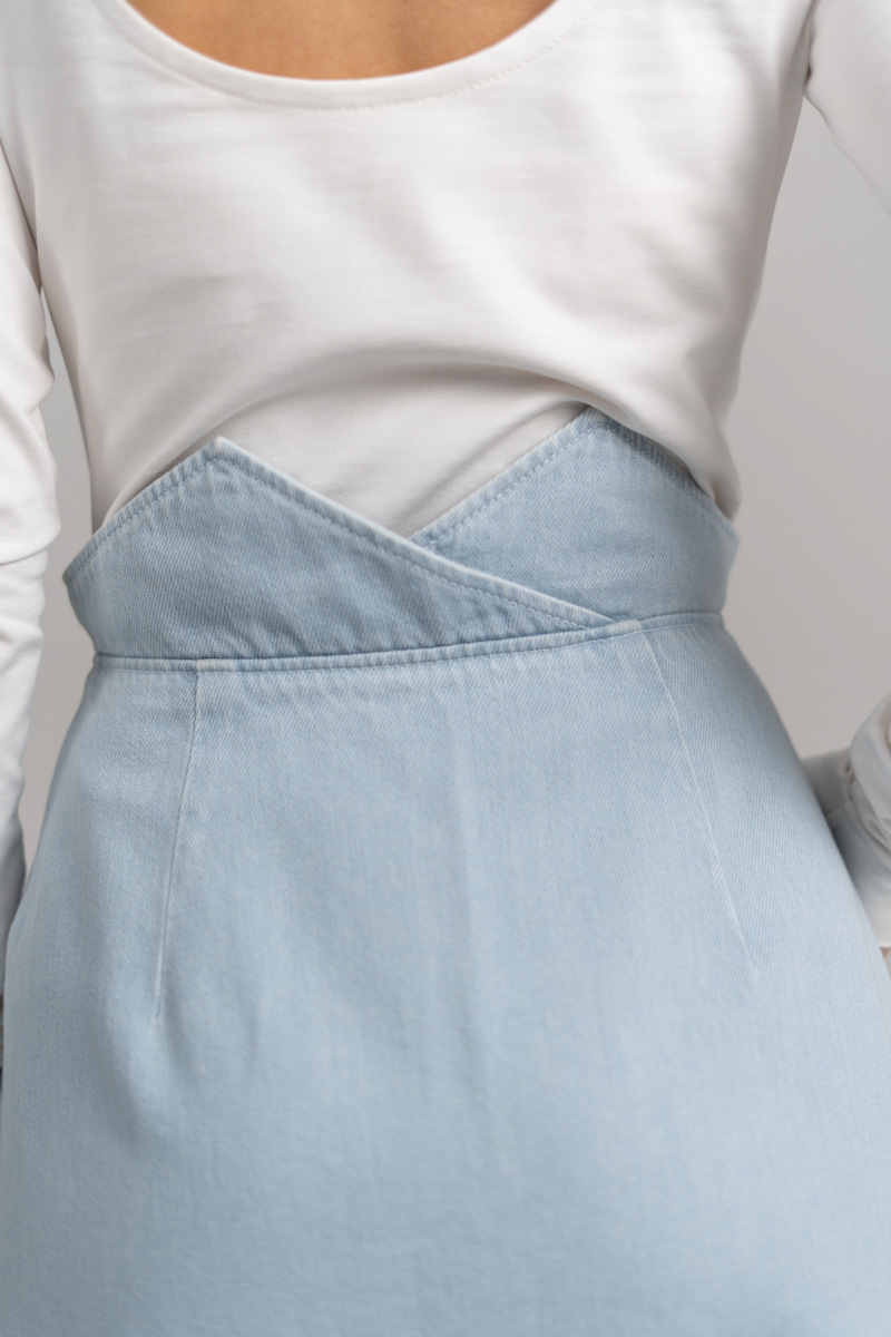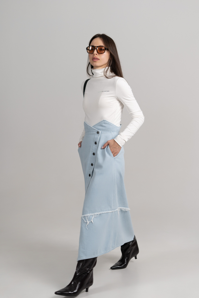 Міді-спідниця світло-блакитного кольору з високою посадкою та А-силуетом, виконана з щільного деніму. Зміщена застібка на кнопках. Асиметричний пояс із металевою пряжкою підкреслює талію. Є бокові кишені.